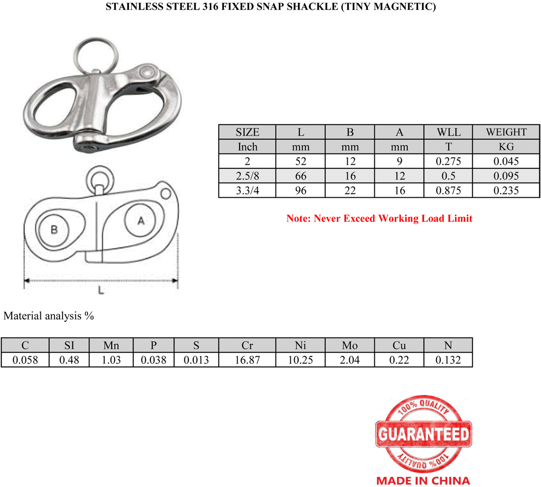 قید قفلی ثابت استیل 316 با قابلیت های شیمیایی بالا در برابر زنگ زدگی در محیط های مرطوب و اغلب با سایز های اینچی به بازار عرضه می گردد. قید قفلی ثابت هم بعنوان یراق آلات در تولید اکسسوری ها مورد استفاده قرار می گیرد و هم از اتصالات کاربردی اسلینگ های سبک سیم بکسلی می باشد. بازرگانی تکین بکسل وارد کننده کلیه اتصالات استنلس استیل در ایران می باشد.